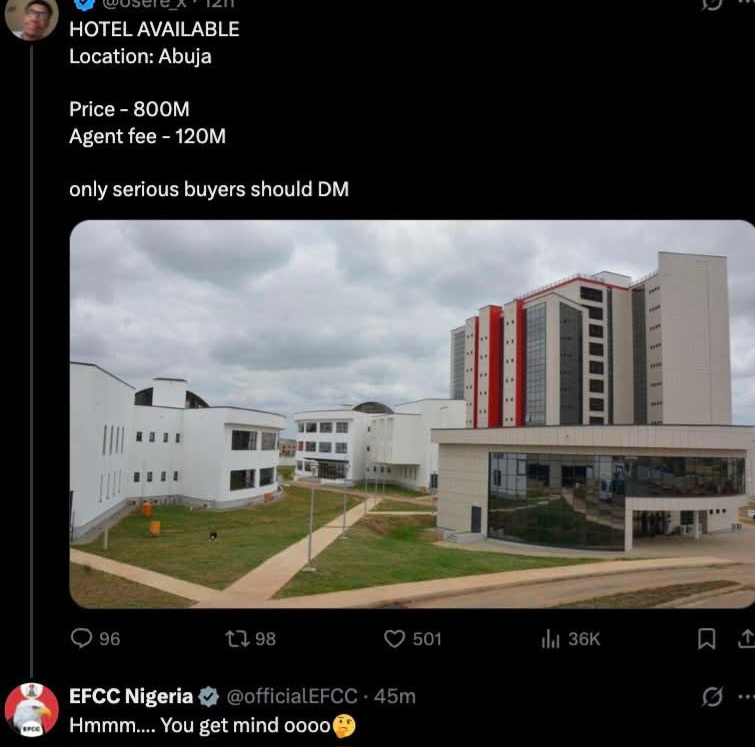 UncategorizedYou Get Mind O!” EFCC’s Abuja HQ Listed as Hotel for Sale on XNewsWorth Media1 month ago1 month ago 1 month ago1 month ago Read more